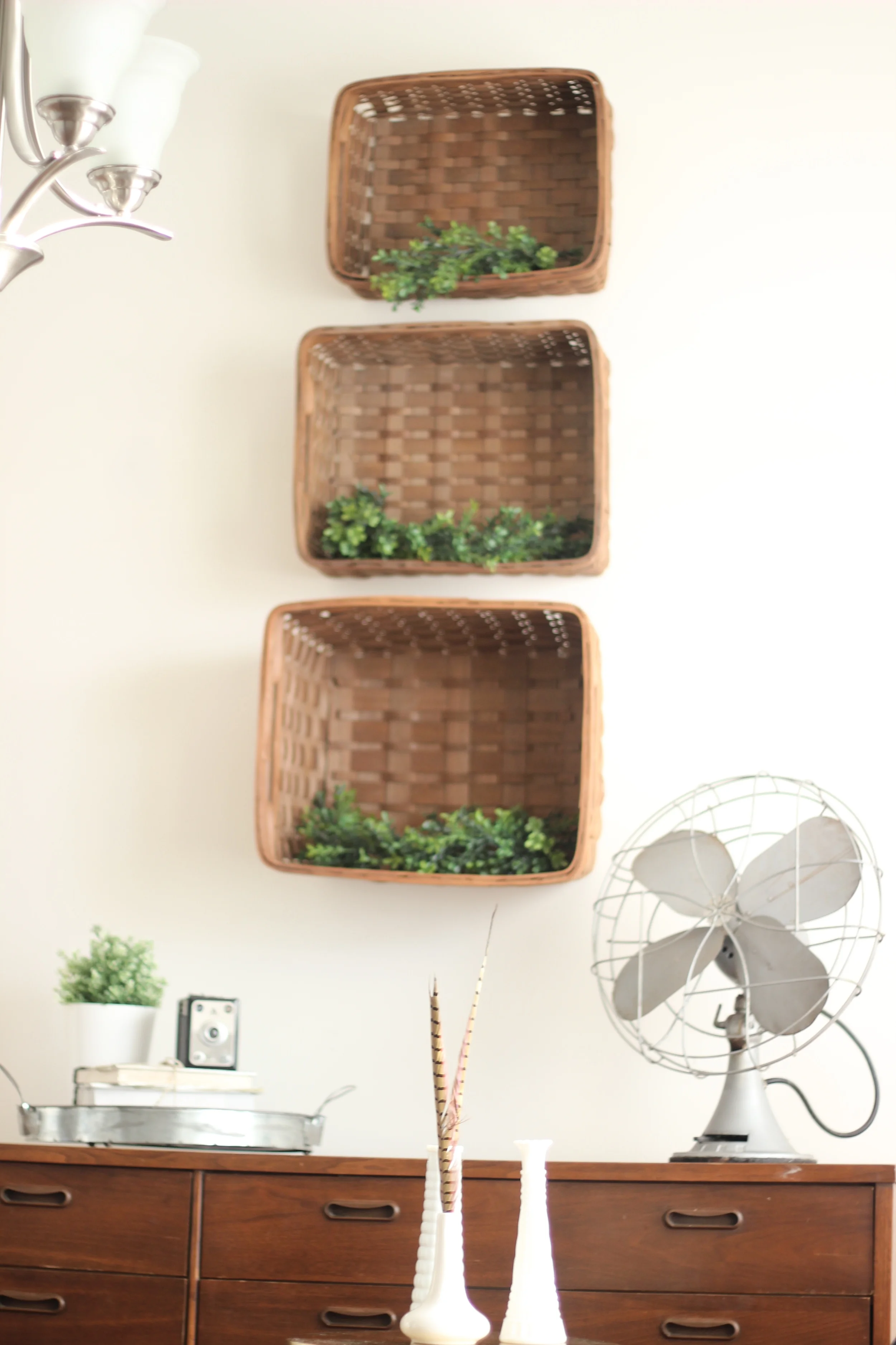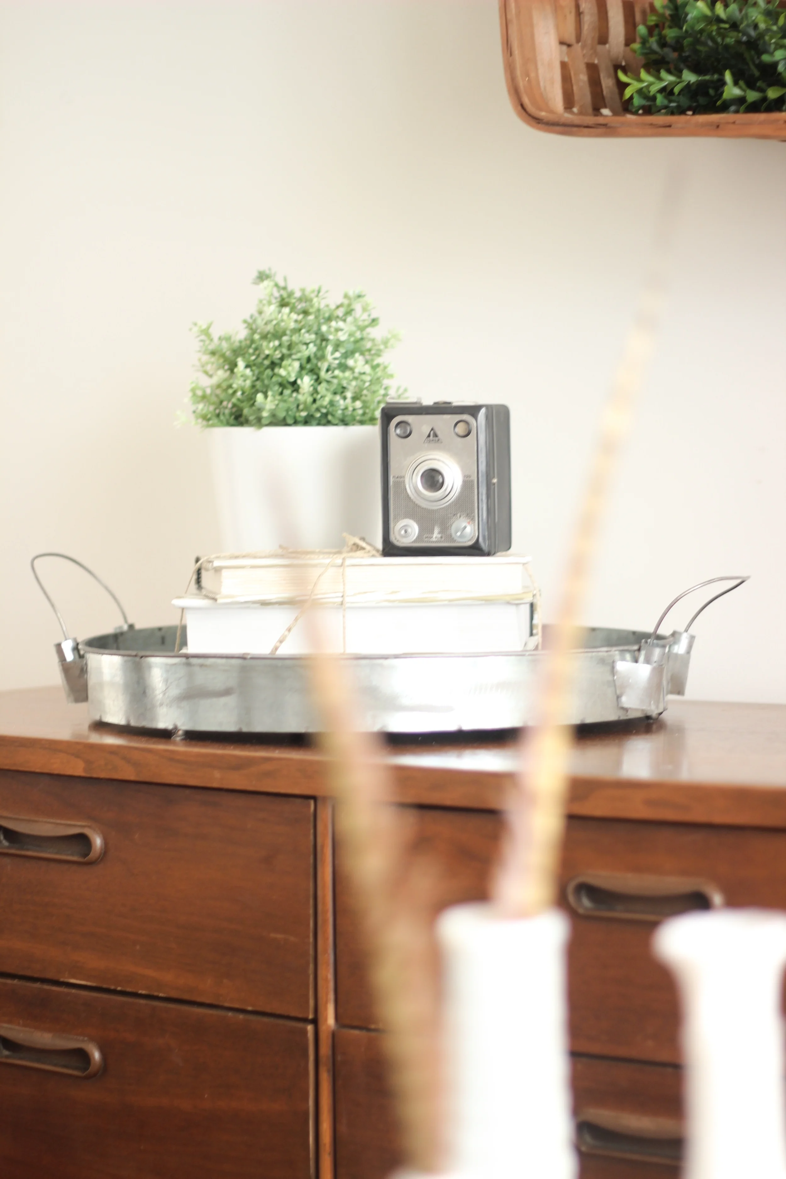 AFTER--Pretty platters on the wall remind us that this is a fully functioning dining area. Marmie's mid-century serving piece was quirky and fun, and she wanted it to stay in the room for extra dish storage. We added a fun mirror over top to dress the space up a bit.